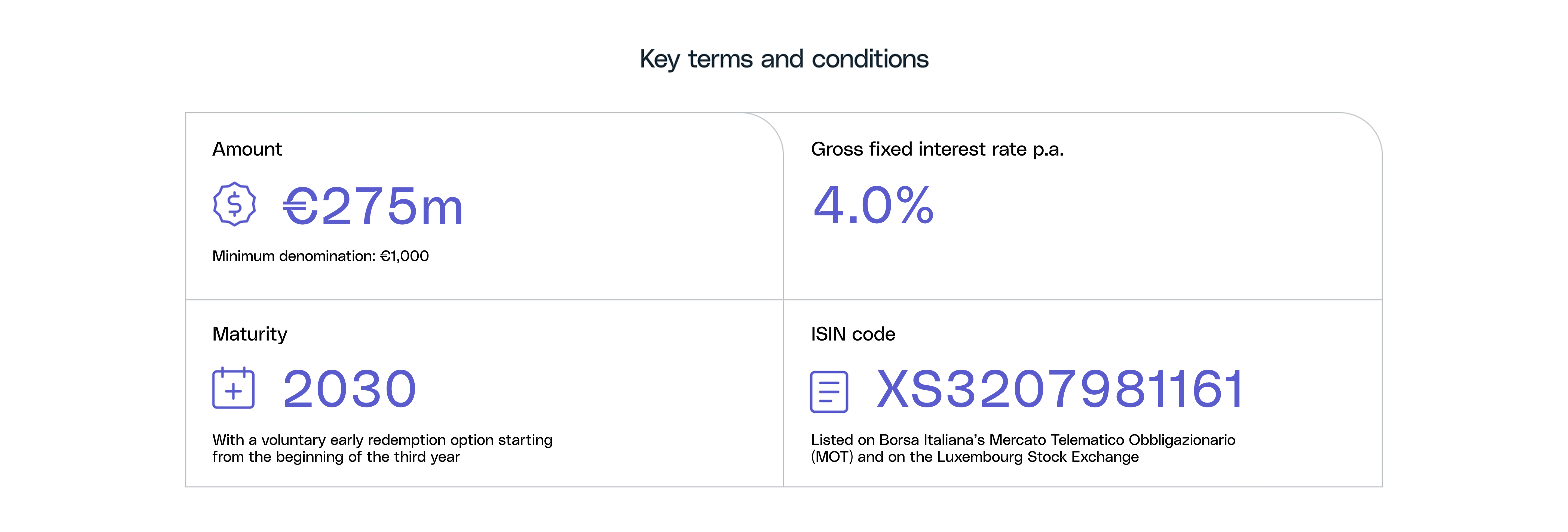 If both targets are met within 2028, the annual gross interest rate will remain unchanged until maturity of the Notes. If MAIRE fails to achieve one or both targets, the interest rate shall be increased by 0.25% p.a. for each target that is not met, starting from the year following the reference year, this being the financial year 2028 (maximum increase of 0.50%), under the terms and conditions described in the Prospectus.