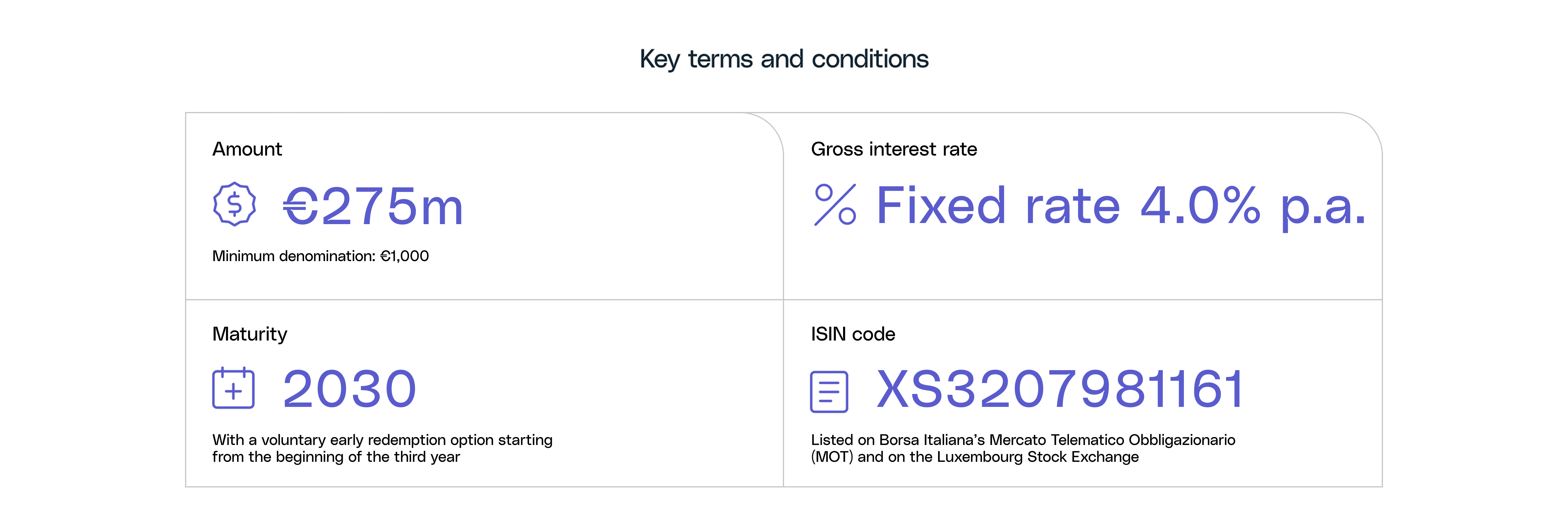If both targets are met within 2028, the annual gross interest rate will remain unchanged until maturity of the Notes. If MAIRE fails to achieve one or both targets, the interest rate shall be increased by 0.25% p.a. for each target that is not met, starting from the year following the reference year, this being the financial year 2028 (maximum increase of 0.50%), under the terms and conditions described in the Prospectus.