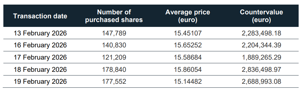PRESS RELEASEMilan, 19 February 2026 – Under the buyback program of treasury shares referred to Art. 5 of the Commission Delegated Regulation (EU) no. 596/2014 (the “MAR”), announced to the market on 28 November 2025 and launched on 1 December 2025 for a maximum number of 10,000,000 ordinary shares (the “Program”) dedicated to the “2021-2023 Long-term Incentive Plan” (with reference to the so-called “Second Deferred Quota”), the “2022-2024 Long-term Incentive Plan” (with reference to the so-called “First Deferred Quota”), the “2023-2025 Long-term Incentive Plan” (with reference to the so-called “Immediate Quota”) and the Third Cycle (2025) of the "Employees Share Ownership Plan 2023-2025dedicated to all employees” (jointly, the “Share Incentive Plans”), MAIRE S.p.A. (the “Company” or “MAIRE”) announces – according to the provision and for the purpose of Article 2 paragraph 3 of the Commission Delegated Regulation (EU) 1052/2016 of 8 March 2016 (the “1052 EU Regulation”) – to have acquired on the Euronext Milan Market (EXM) organized and managed by Borsa Italiana S.p.A., in the period from 13 February 2026 to 19 February 2026 included, total no. 766,220 of treasury shares (corresponding to 0.233% of the total number of ordinary shares), at a weighted average price of Euro 15.534 for a total counter-value of Euro 11,902,599.91.