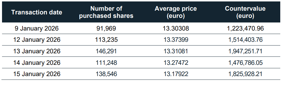 PRESS RELEASEMilan, 15 January 2026 – Under the buyback program of treasury shares referred to Art. 5 of the Commission Delegated Regulation (EU) no. 596/2014 (the “MAR”), announced to the market on 28 November 2025 and launched on 1 December 2025 for a maximum number of 10,000,000 ordinary shares (the “Program”) dedicated to the “2021-2023 Long-term Incentive Plan” (with reference to the so-called “Second Deferred Quota”), the “2022-2024 Long-term Incentive Plan” (with reference to the so-called “First Deferred Quota”), the “2023-2025 Long-term Incentive Plan” (with reference to the so-called “Immediate Quota”) and the Third Cycle (2025) of the "Employees Share Ownership Plan 2023-2025dedicated to all employees” (jointly, the “Share Incentive Plans”), MAIRE S.p.A. (the “Company” or “MAIRE”) announces – according to the provision and for the purpose of Article 2 paragraph 3 of the Commission Delegated Regulation (EU) 1052/2016 of 8 March 2016 (the “1052 EU Regulation”) – to have acquired on the Euronext Milan Market (EXM) organized and managed by Borsa Italiana S.p.A., in the period from 9 January 2026 to 15 January 2026 included, total no. 601,289 of treasury shares (corresponding to 0.183% of the total number of ordinary shares), at a weighted average price of Euro 13.285 for a total counter-value of Euro 7,987,840.69.