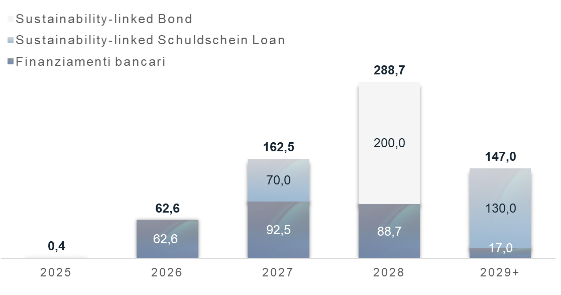 (2) Principalmente a tassi di interesse variabili. Il costo dello strumento prevede altresì variazioni, in diminuzione o in aumento, legate al raggiungimento di obiettivi di riduzione di emissioni di CO2 del Gruppo