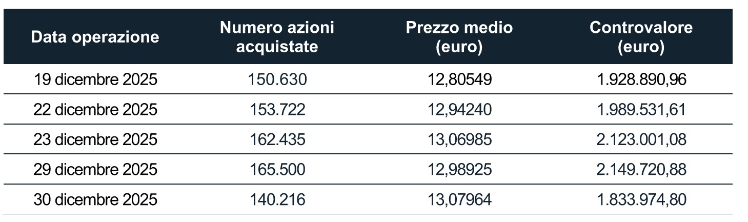 COMUNICATO STAMPAMilano, 30 dicembre2025 – Nell’ambito del programma di acquisto di azioni proprie, di cui all'art. 5 del Regolamento (UE) n. 596/2014 (la “MAR”), comunicato al mercato in data 28 novembre 2025 ed avviato in data 1 dicembre 2025 per massime n. 10.000.000 azioni ordinarie (il “Programma”) a servizio del “Piano di Incentivazione di Lungo Termine 2021-2023” (con riferimento alla c.d. “Seconda Quota Differita”), del “Piano di Incentivazione di Lungo Termine 2022-2024” (con riferimento alla c.d. “Prima Quota Differita”), del “Piano di Incentivazione di Lungo Termine 2023-2025” (con riferimento alla c.d. “Quota Immediata”) e del Terzo Ciclo (2025) del “Piano di Azionariato diffuso 2023-2025, rivolto alla generalità dei dipendenti” (congiuntamente, i “Piani di Incentivazione Azionaria”), MAIRE S.p.A. (la “Società” o “MAIRE”) comunica – ai sensi e per gli effetti dell’art. 2, paragrafo 3 del Regolamento Delegato (UE) n. 1052/2016 della Commissione dell’8 marzo 2016 (il “Regolamento UE 1052”) – di aver acquistato sul mercato Euronext Milan (EXM) organizzato e gestito da Borsa Italiana S.p.A., nel periodo compreso tra il 19 dicembre 2025 ed il 30 dicembre 2025 inclusi, complessive n. 772.503 azioni proprie (corrispondenti allo 0,235% del numero complessivo di azioni ordinarie), al prezzo medio ponderato di Euro 12,977 per un controvalore titoli complessivo pari a Euro 10.025.119,33.