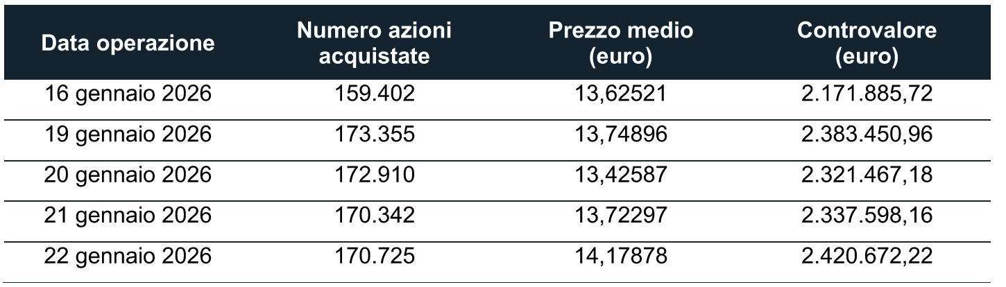 COMUNICATO STAMPAMilano, 22 gennaio 2026 – Nell’ambito del programma di acquisto di azioni proprie, di cui all'art. 5 del Regolamento (UE) n. 596/2014 (la “MAR”), comunicato al mercato in data 28 novembre 2025 ed avviato in data 1 dicembre 2025 per massime n. 10.000.000 azioni ordinarie (il “Programma”) a servizio del “Piano di Incentivazione di Lungo Termine 2021-2023” (con riferimento alla c.d. “Seconda Quota Differita”), del “Piano di Incentivazione di Lungo Termine 2022-2024” (con riferimento alla c.d. “Prima Quota Differita”), del “Piano di Incentivazione di Lungo Termine 2023-2025” (con riferimento alla c.d. “Quota Immediata”) e del Terzo Ciclo (2025) del “Piano di Azionariato diffuso 2023-2025, rivolto alla generalità dei dipendenti” (congiuntamente, i “Piani di Incentivazione Azionaria”), MAIRE S.p.A. (la “Società” o “MAIRE”) comunica – ai sensi e per gli effetti dell’art. 2, paragrafo 3 del Regolamento Delegato (UE) n. 1052/2016 della Commissione dell’8 marzo 2016 (il “Regolamento UE 1052”) – di aver acquistato sul mercato Euronext Milan (EXM) organizzato e gestito da Borsa Italiana S.p.A., nel periodo compreso tra il 16 gennaio 2026 ed il 22 gennaio 2026 inclusi, complessive n. 846.734 azioni proprie (corrispondenti allo 0,258% del numero complessivo di azioni ordinarie), al prezzo medio ponderato di Euro 13,741 per un controvalore titoli complessivo pari a Euro 11.635.074,24.