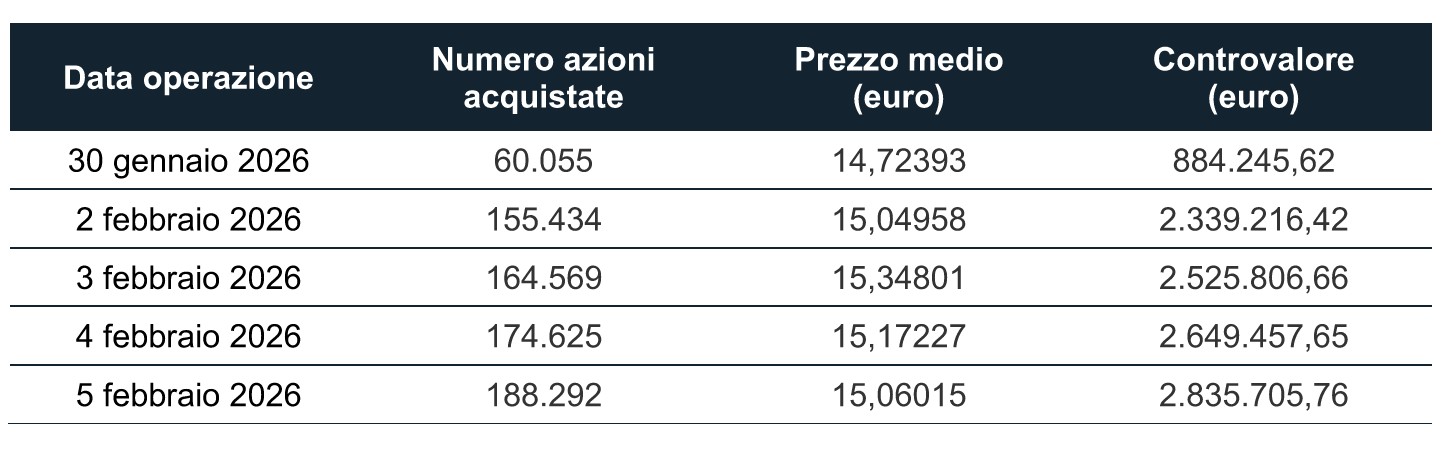 COMUNICATO STAMPAMilano, 5 febbraio 2026 – Nell’ambito del programma di acquisto di azioni proprie, di cui all'art. 5 del Regolamento (UE) n. 596/2014 (la “MAR”), comunicato al mercato in data 28 novembre 2025 ed avviato in data 1 dicembre 2025 per massime n. 10.000.000 azioni ordinarie (il “Programma”) a servizio del “Piano di Incentivazione di Lungo Termine 2021-2023” (con riferimento alla c.d. “Seconda Quota Differita”), del “Piano di Incentivazione di Lungo Termine 2022-2024” (con riferimento alla c.d. “Prima Quota Differita”), del “Piano di Incentivazione di Lungo Termine 2023-2025” (con riferimento alla c.d. “Quota Immediata”) e del Terzo Ciclo (2025) del “Piano di Azionariato diffuso 2023-2025, rivolto alla generalità dei dipendenti” (congiuntamente, i “Piani di Incentivazione Azionaria”), MAIRE S.p.A. (la “Società” o “MAIRE”) comunica – ai sensi e per gli effetti dell’art. 2, paragrafo 3 del Regolamento Delegato (UE) n. 1052/2016 della Commissione dell’8 marzo 2016 (il “Regolamento UE 1052”) – di aver acquistato sul mercato Euronext Milan (EXM) organizzato e gestito da Borsa Italiana S.p.A., nel periodo compreso tra il 30 gennaio 2026 ed il 5 febbraio 2026 inclusi, complessive n. 742.975 azioni proprie (corrispondenti allo 0,226% del numero complessivo di azioni ordinarie), al prezzo medio ponderato di Euro 15,121 per un controvalore titoli complessivo pari a Euro 11.234.432,11.