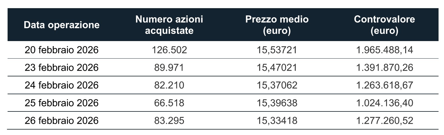 COMUNICATO STAMPAMilano, 26 febbraio 2026 – Nell’ambito del programma di acquisto di azioni proprie, di cui all'art. 5 del Regolamento (UE) n. 596/2014 (la “MAR”), comunicato al mercato in data 28 novembre 2025 ed avviato in data 1 dicembre 2025 per massime n. 10.000.000 azioni ordinarie (il “Programma”) a servizio dei Piani di Incentivazione Azionaria in essere, MAIRE S.p.A. (la “Società” o “MAIRE”) comunica – ai sensi e per gli effetti dell’art. 2, paragrafo 3 del Regolamento Delegato (UE) n. 1052/2016 della Commissione dell’8 marzo 2016 (il “Regolamento UE 1052”) – di aver acquistato sul mercato Euronext Milan (EXM) organizzato e gestito da Borsa Italiana S.p.A., nel periodo compreso tra il 20 febbraio 2026 ed il 26 febbraio 2026 inclusi, complessive n. 448.496 azioni proprie (corrispondenti allo 0,136% del numero complessivo di azioni ordinarie), al prezzo medio ponderato di Euro 15,435 per un controvalore titoli complessivo pari a Euro 6.922.373,99.